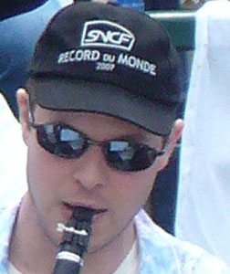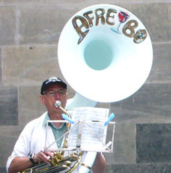 Jackie's band, Afreybo, is made up of people, most of whom, work in the fields of medicine and science. They relax away from work by being playful with their music and their band uniforms, which are lab coats with self mocking cartoons drawn on the back. For this occasion they were also wearing caps celebrating the "SNCF World Record 2007".